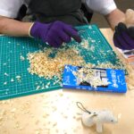 Mさんは電車モチーフの置物づくりに挑戦。久しぶりの彫刻刀に少し緊張しながらも、丁寧に線を彫っていきます。