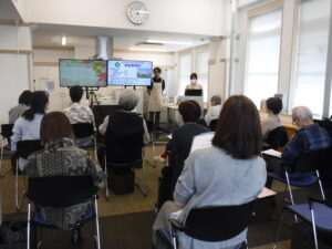 講義では、フレイル予防に欠かせない栄養素をバランスよく摂るコツや、不足しがちな栄養を補うための栄養補助食品の活用法を教えていただきました。おすすめのレシピとして、DHAが豊富で手軽に作れる『さばマヨサンドイッチ』や、『栄養補助食品のゼリー』をご紹介いただき、参加者で試食しました。さらに、お口のフレイル予防につながる「パタカラ体操」や嚥下訓練の大切さについても学びました。フレイルの兆候をチェックする「フレイルテスト」、筋肉量の低下を簡単に調べる「指輪っかテスト」も体験し、自分の健康について改めて考える機会になりました。