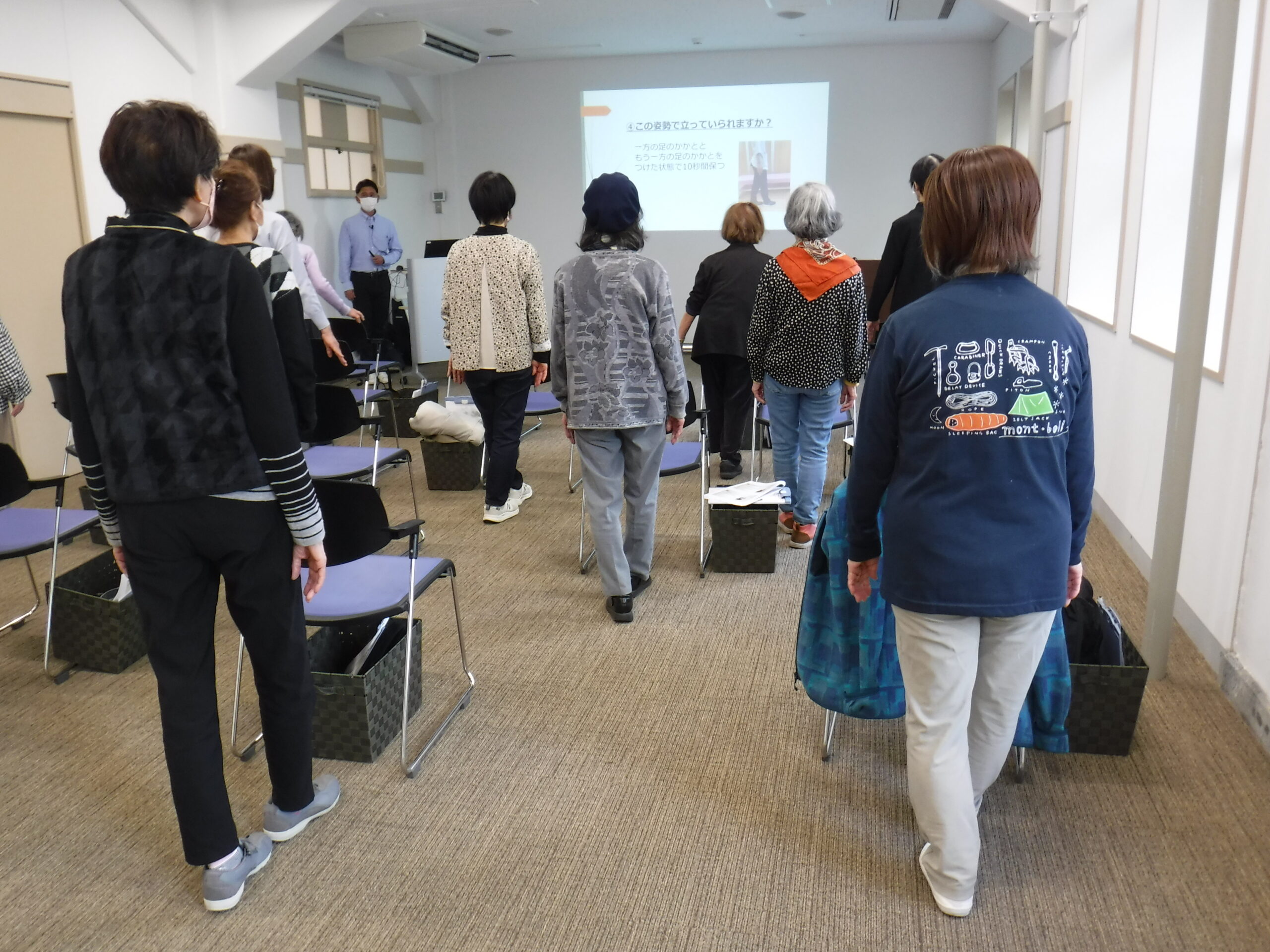 転ばないからだをつくるためには、身体を支える『筋力』、身体や周囲の変化の情報を神経に伝える『感覚』、とっさに考えて行動する『判断力』のバランスが重要であり、身体と頭(脳)が密接に連動していることがわかりました。実践では、初級から中級レベルまで幅広いトレーニングが紹介されました。椅子に座った状態で行えるものから、立って行う動きまで、様々なメニューがあり、参加者の体力や状態に合わせて取り組むことができました。