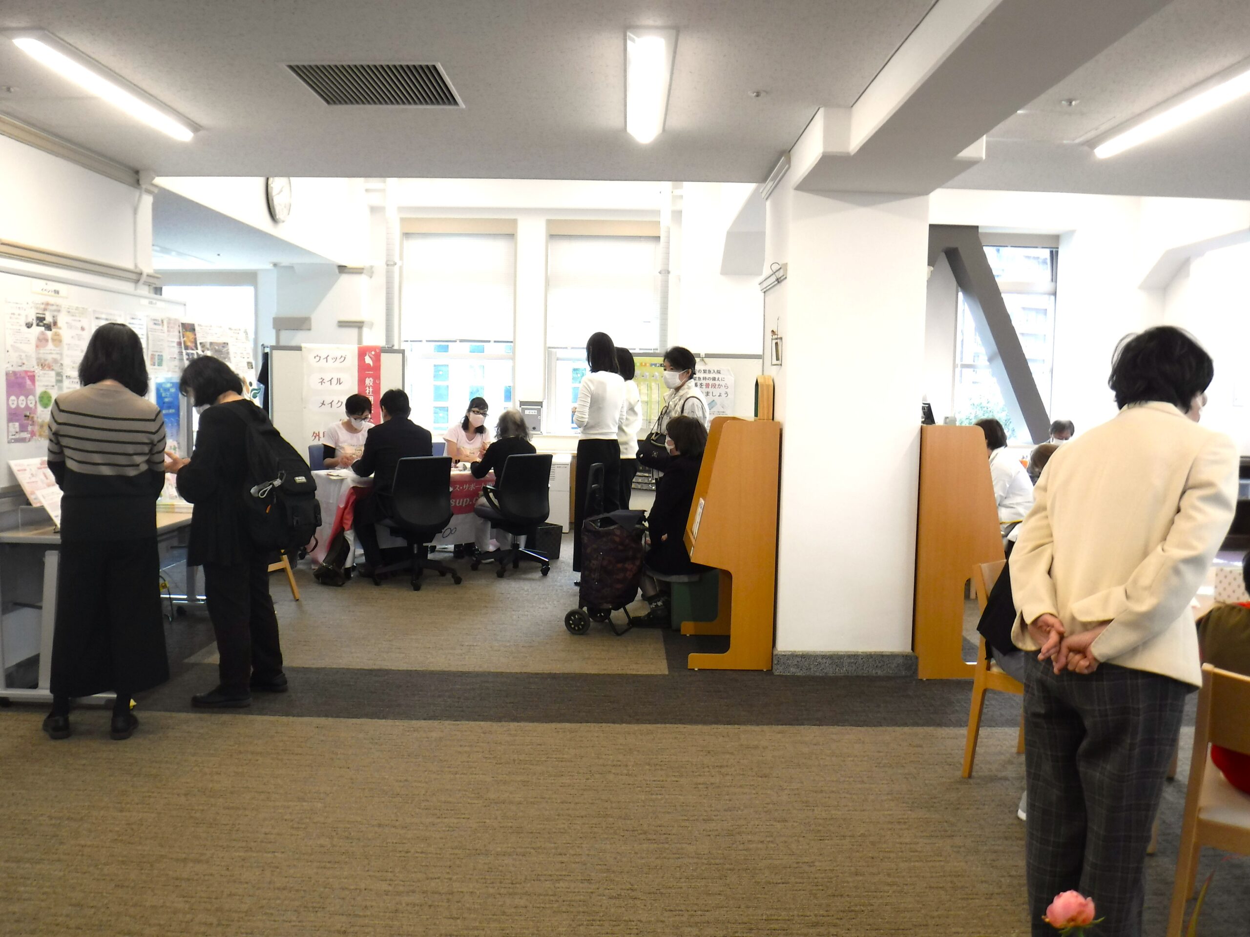 今年のテーマ「ありのままに生きる」は、ヨシタケシンスケ先生の著書『メメンとモリ』からインスピレーションをいただきました。緩和ケアがもつ色や音の多様性を、「私の好きなこと」という言葉にのせて、シンボルツリーに描きました。ツリーの前に立つと、ひとつひとつの言葉があたたかく、そっと寄り添ってくれるようでした。 スタッフや施設支援者がおすすめする本を展示した図書コーナーでは、訪れた方々が気になる一冊を手に取り、のんびりと“自分のペース”で過ごされていました。ソファに腰をおろし、窓の外を静かに眺めるひと時は、まるで深呼吸をするような落ち着きを運んでくれます。さらに、ハンドマッサージの心地よい温もりに身をゆだねたり、お薬に関するちょっとした相談をしたりと、会場全体が「ここにいていいんだ」と思えるようなやさしい空気に包まれていました。