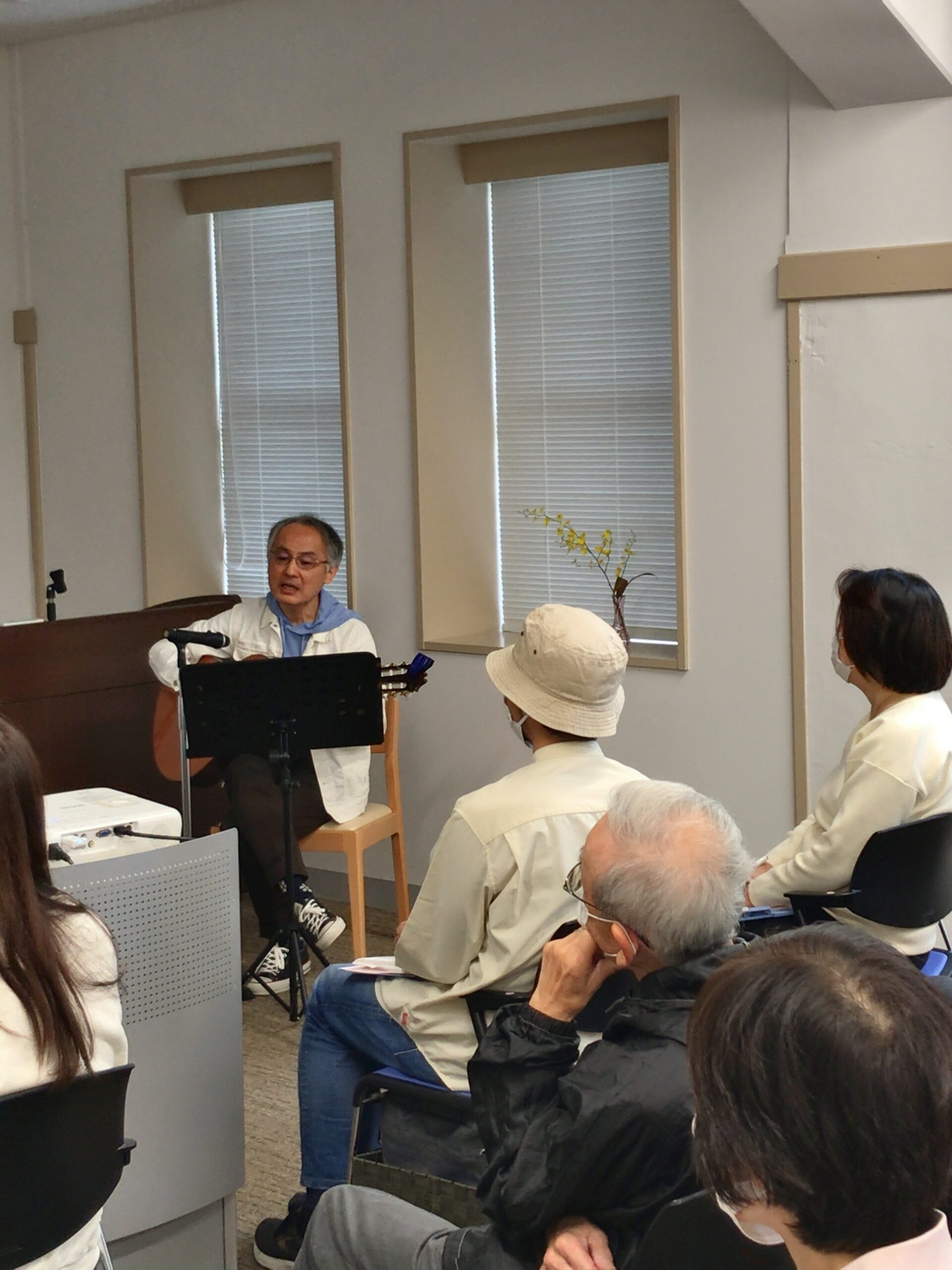 儀賀先生の語る「緩和ケア」は、だれの心にもすっと馴染む内容でした。会場のみなさんと完成させた歌詞を先生がギターで歌ってくださる場面もあり、ういケアみなとらしい講演会になりました。