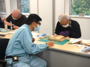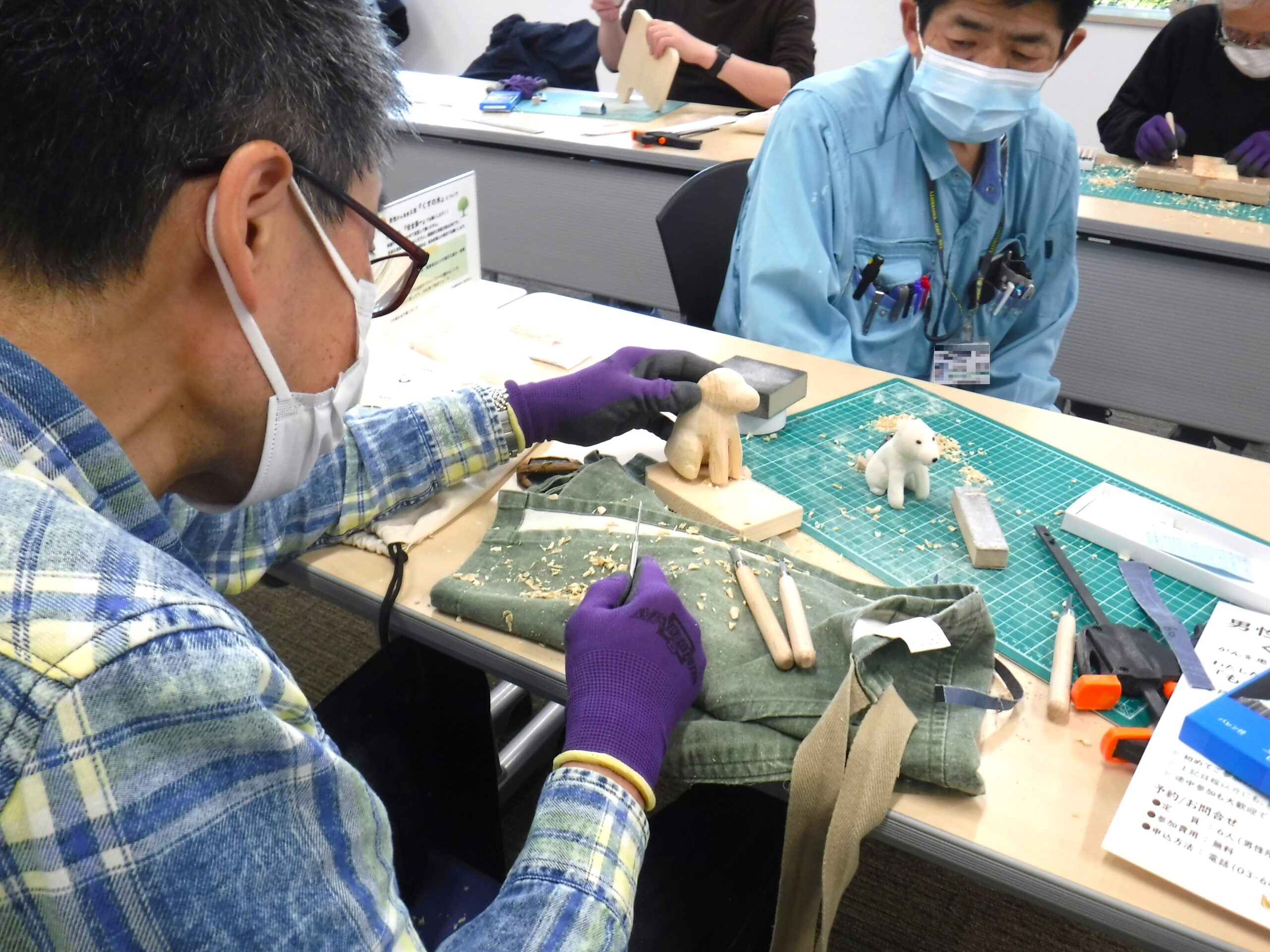 Oさんは彫刻刀で一彫り一彫りに思いを込めて、Kさんはナイフを軽やかに操り、迷いのない手つきで木を削っていきます。完成はまだまだ先ですが、形が少しずつ見えてくる「今この瞬間」の姿を味わいながら、ものづくりの時間そのものを楽しんでいます。