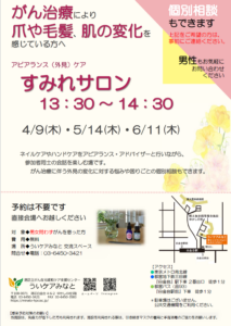 4/9(木) アピアランス(外見)ケア すみれサロン 2026年3月2日 最終更新日時 : 2026年3月2日 uikeaminato 開催日: 2026年4月9日 1:30 PM - 2:30 PMカテゴリー: すみれサロン がん治療により爪や毛髪、肌の変化を感じている方へ 爪の保湿ケアやマニキュアを塗ったりしながらアドバイザーにアピアランスの相談ができます。対象:男女問わずがんを患った方 予約不要です。 詳細はチラシ画像をクリックしてください FacebookXBlueskyHatenaPocketCopy