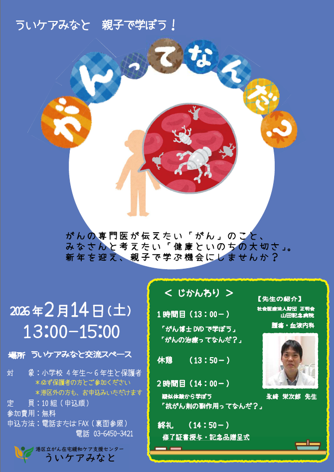 ういケアみなと 親子で学ぼう! がんってなんだ? 2026年1月22日 最終更新日時 : 2026年1月22日 minato-hpccsc がんの専門医が伝えたい「がん」のこと、みなさんと考えたい「健康といのちの大切さ」、新年を迎え、親子で学ぶ機会にしませんか? 詳細は下のチラシ画像をクリックしてください Follow me! FacebookXBlueskyHatenaPocketCopy